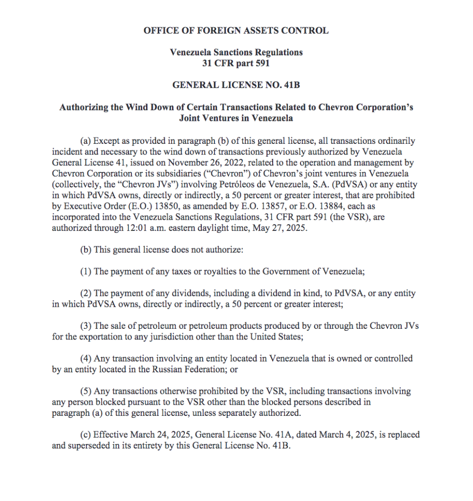 La Oficina de Control de Activos Extranjeros (OFAC) de Estados Unidos emitió la licencia 41B una extensión para el plazo del cese de operaciones en Venezuela de Chevron Corporation.