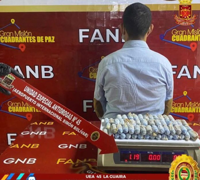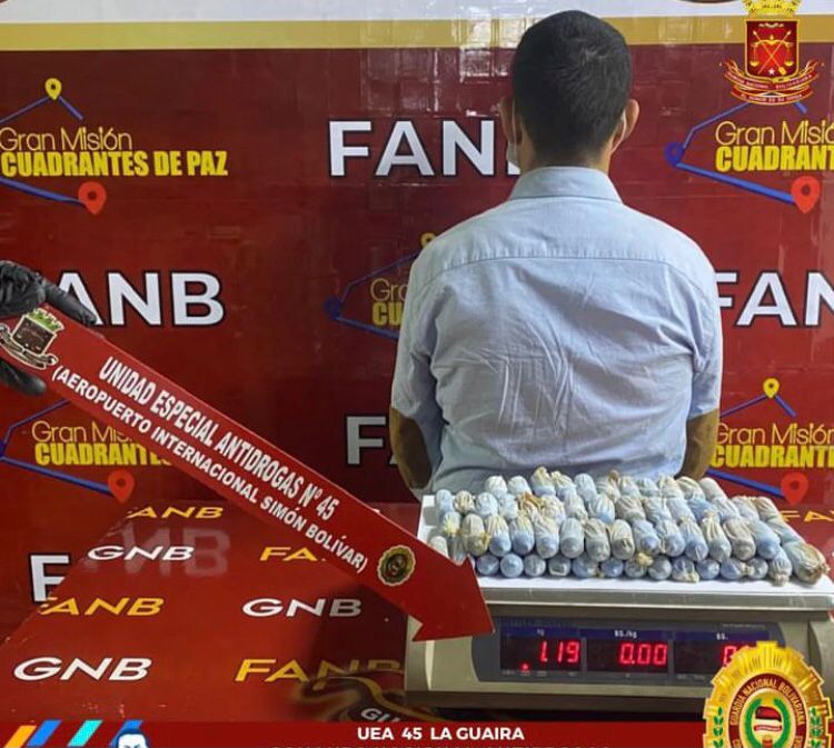 Efectivos de la Guardia Nacional Bolivariana (GNB) adscritos a la Unidad Especial Antidrogas número 45 de La Guaira, destacados en el Aeropuerto Internacional Simón Bolívar de Maiquetía, detuvieron a un sujeto que pretendía viajar a Madrid, España, con 83 dediles de cocaína en su organismo.