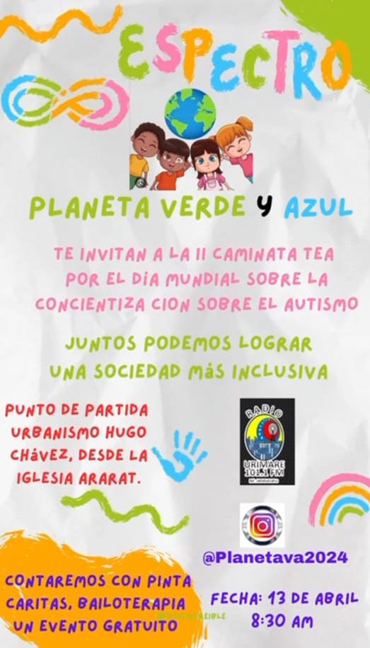 La organización Planeta Verde Y Azul anuncia la realización de la II Caminata TEA, un evento diseñado para conmemorar el Día Mundial de Concienciación sobre el Autismo y fomentar la inclusión en la sociedad, y tendrá lugar el domingo 13 de abril a las 8:30 a.m, en el Urbanismo Hugo Chávez, desde la Iglesia Ararat.
