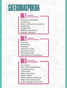 Para el domingo 1 de diciembre, los artistas demostrarán sus habilidades en categorías como fusión artística, arte libre venezolano, sombras libres, color libre, blanco y negro, mejor stand, mejor artista femenina, mejor fluidez del evento y mejor tatuaje del evento. Finalmente, el 2 de diciembre se celebrará el After Party exclusivamente para los participantes del evento, con entrada gratuita para los artistas.