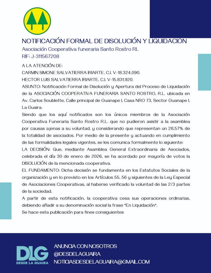 ASUNTO: Notificación Formal de Disolución y Apertura del Proceso de Liquidación de la ASOCIACIÓN COOPERATIVA FUNERARIA SANTO ROSTRO, R.L. ubicada en Av. Carlos Soublette, Calle principal de Guanape I, Casa NRO 73, Sector Guanape I, La Guaira.
