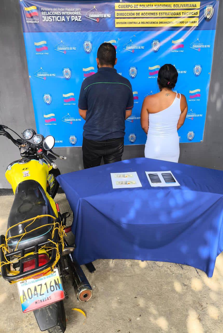 Funcionarios de la División Contra la Delincuencia Organizada de la Policía Nacional Bolivariana (CPNB-DAET), Base La Guaira, lograron la aprehensión en flagrancia de Juan Andrés Hernández Sánchez (26) y Nathaly Alexandra Medina Díaz (31) por el delito de “Contra la Fe Pública”, tras intentar realizar compras con moneda extranjera falsificada en el Comercial La Costanera de Caraballeda.